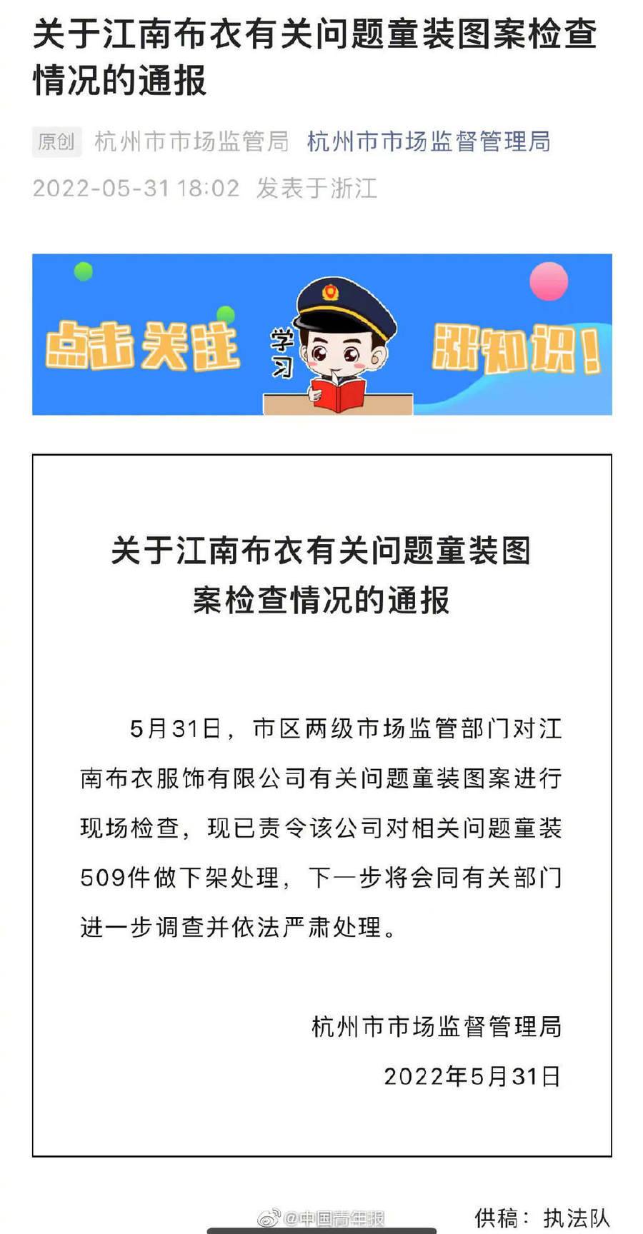 对此,市场监管部门迅速行动。5月31日,浙江省杭州市市场监管局通报称,市区两级市场监管部门对江南布衣服饰有限公司有关问题童装图案进行现场检查,现已责令该公司对相关问题童装509件做下架处理。