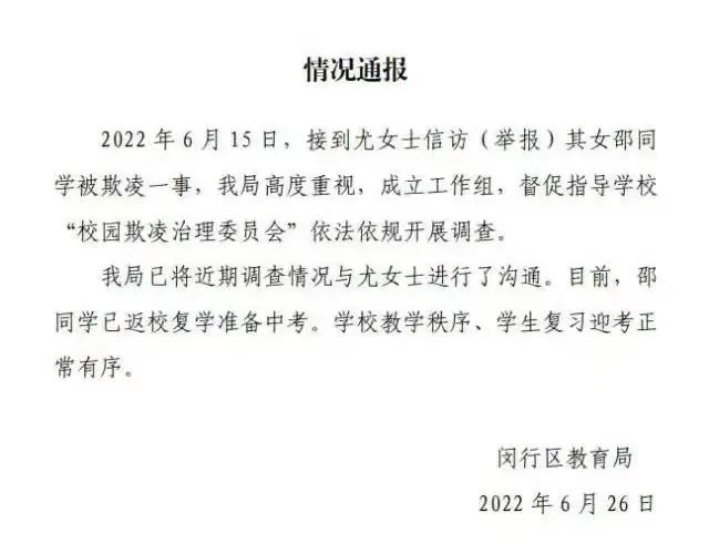 6月26日,上海市闵行区教育局就此事进行通报:成立工作组,督促指导学校“校园欺凌治理委员会”依法依规开展调查。
