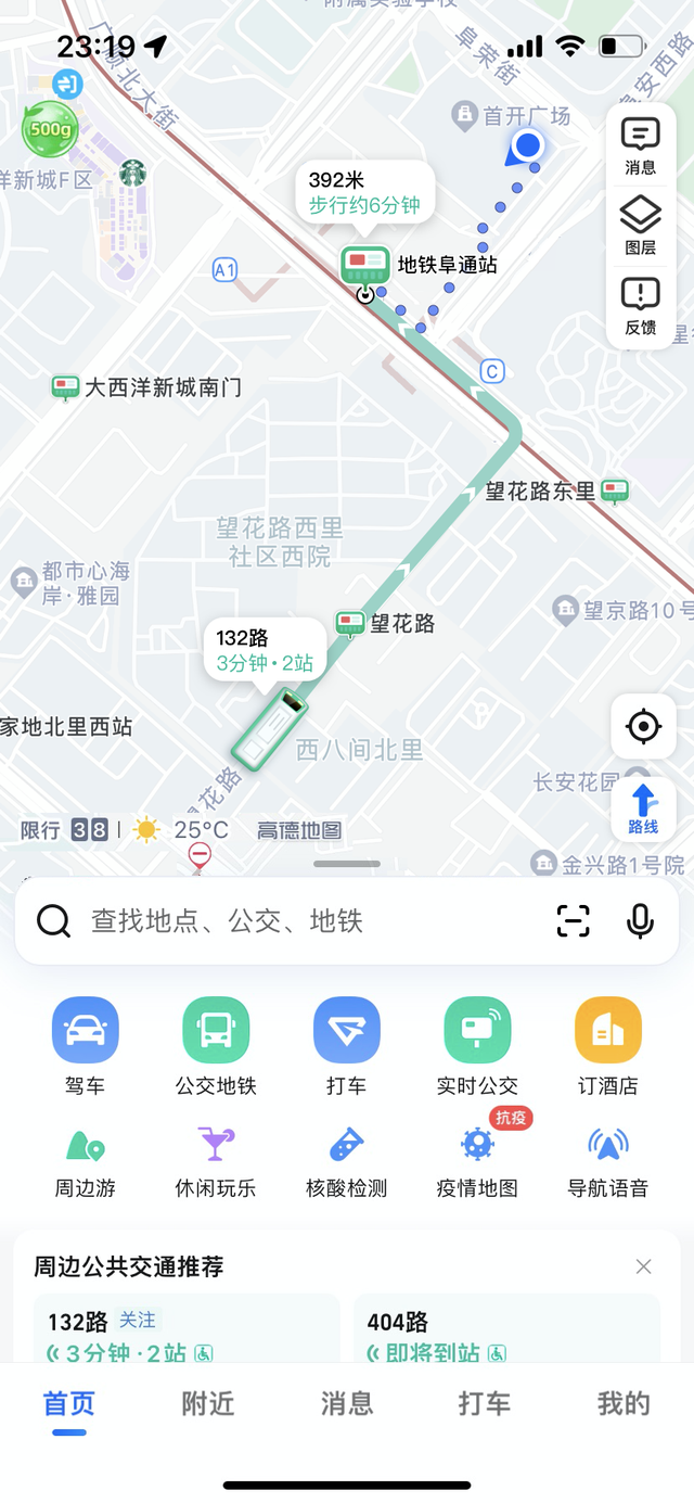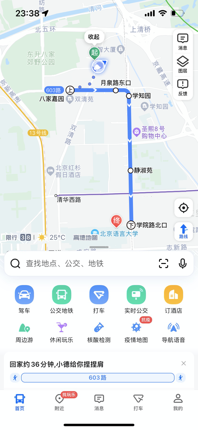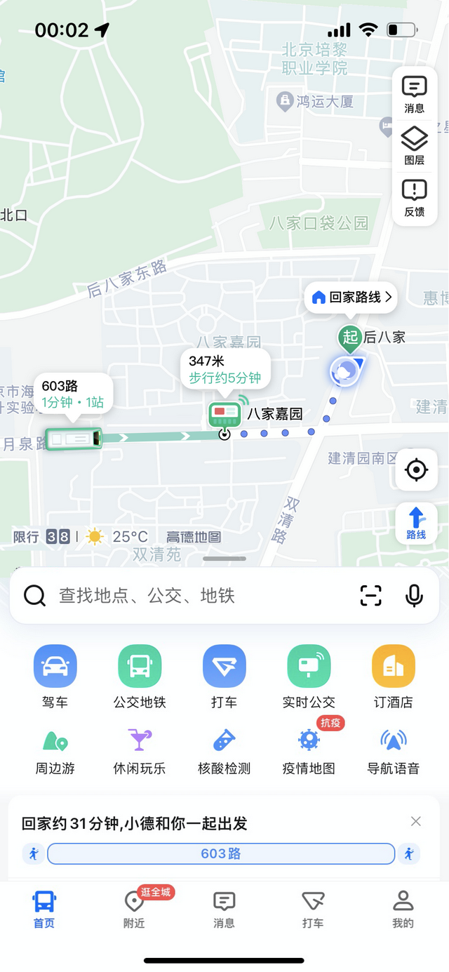 智能展示 回家线路实时规划 本次升级的另一大亮点,是回家公交线路的智选展示——根据用户所在位置和时间,通过在首页智能展示的路线规划方案,帮助用户了解更优回家路线: 只要在高德地图首页上拉列表,找到"常用地点",完善家庭住址信息,就可智能获取对应的回家最优公交线路规划。 这样一来,即使用户到了陌生地点,也无需再在手机上搜索查找,从当前所在位置怎么坐公交或地铁到家,在APP首页就能看到,点击后还能展开具体换乘与步行方案,一目了然。