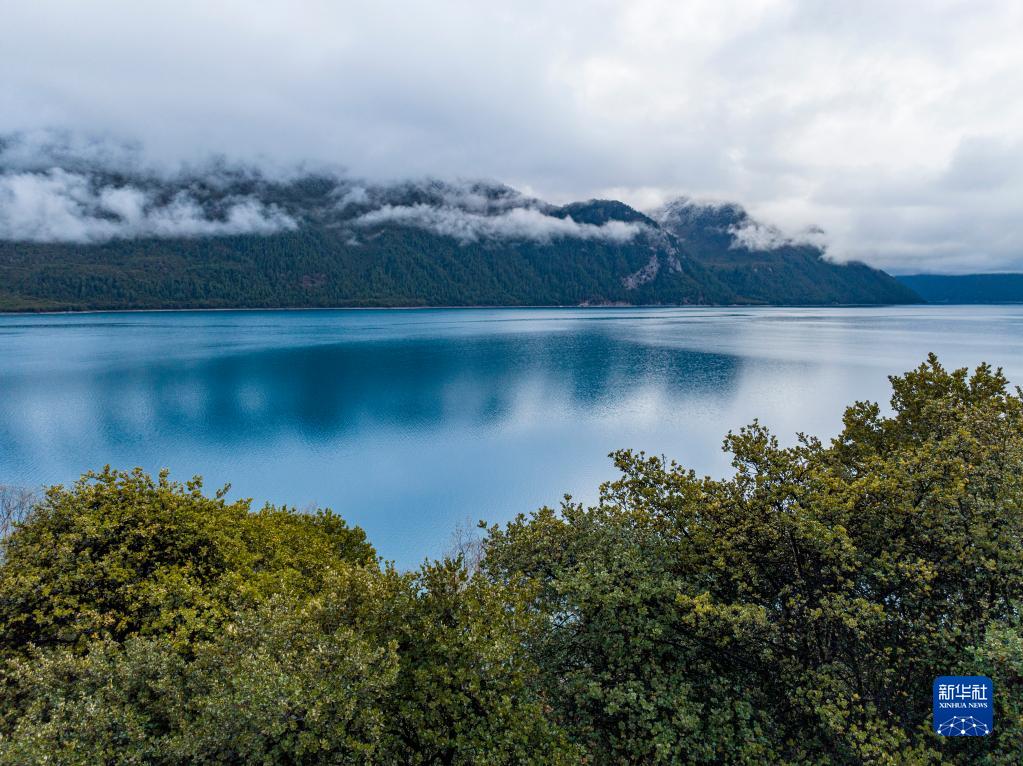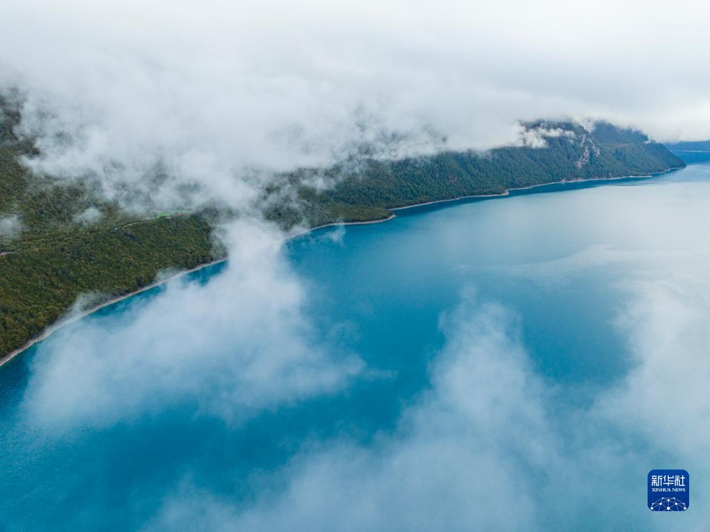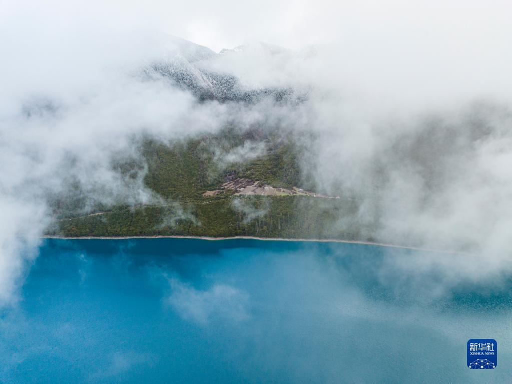 4月17日拍摄的巴松措(无人机照片)。 巴松措又名错高湖,位于西藏林芝工布江达县。清晨时分,巴松措湖面上云雾缭绕,宛若仙境。