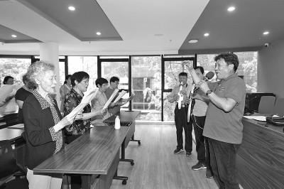 5月29日,在爱山街道利民社区,老年居民参加合唱活动。 浙江省湖州市爱山街道根据辖区特色,将“一老一小”作为重点服务群体,打造居民15分钟便民生活圈,切实满足市民生活需求。
