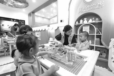 5月29日,在爱山街道利民社区,一个公益组织的老师带着儿童玩积木。 浙江省湖州市爱山街道根据辖区特色,将“一老一小”作为重点服务群体,打造居民15分钟便民生活圈,切实满足市民生活需求。