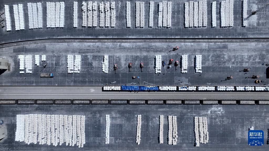 6月12日,在青海盐湖工业股份有限公司钾肥分公司货场,工作人员在装运钾肥(无人机照片)。