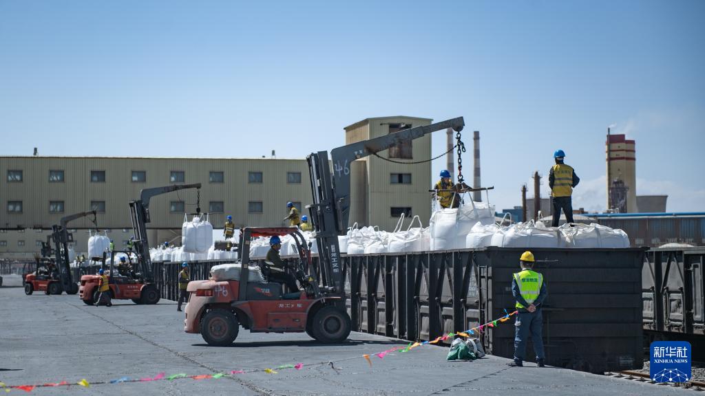 6月12日,在青海盐湖工业股份有限公司钾肥分公司货场,工作人员在装运钾肥。