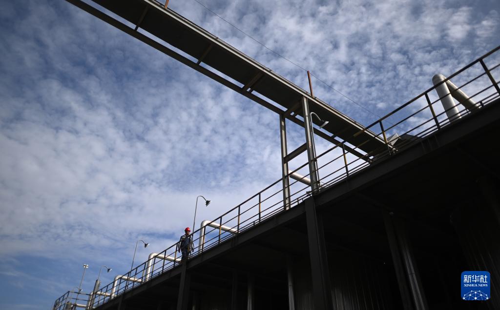 一名工作人员在青海盐湖蓝科锂业股份有限公司生产区内巡检(6月9日摄)。