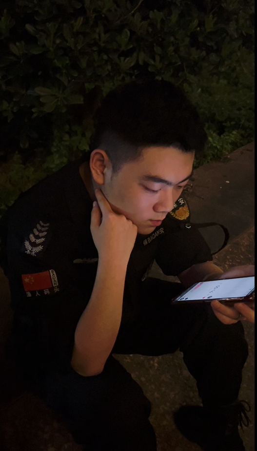 △渔人码头夜景 江边的步道上,人人行色匆匆。偶遇朱同学时,他正独自坐在远离热闹的食客们的地方。穿一身全黑的保安制服,双手环抱住膝盖,一张白净的娃娃脸,表情却很老成。 今年18岁的朱同学是一名军校大一学生。利用放假的时间,他回到长沙,兼职做保安。朱同学面部表情不多,看起来很冷静的样子。但回忆起抚养他长大的舅舅时,朱同学的嘴角忍不住上扬。“我舅舅以前是一名坦克手。都说上阵父子兵嘛”,所以自己在舅舅的影响下选择报考了军校。 虽然是军校出身,但朱同学和其他年轻人一样,喜欢流行音乐。时下流行的说唱是他最近的偏爱,他在音乐平台上拥有自己的音乐人账号,拥有一千多位粉丝。闲来无事,朱同学和朋友一起写歌、录歌,记录自己的心情和心事,哪怕直到现在他都看不懂五线谱。 兼职的这些天里,朱同学处理过一次突发情况。“有一个女生喝醉了倒在台阶上,我就跟我们的领班报备之后再报警、打120让他们过来处理。警察来之前,有一个她手机里的陌生号码(没存联系人)打过来说要来接她,我一开始还不放心,因为是陌生号码嘛。”朱同学一直等民警与前来接她回家的朋友沟通好,才离开现场,回到岗位上巡逻。 谈起毕业后的道路,朱同学坦言自己还不太清楚。“但我是比较有想法的,我还是想选自己感兴趣、又适合自己的,去做一些事情。” 关于“这些事情”,朱同学并没有说得太明白。