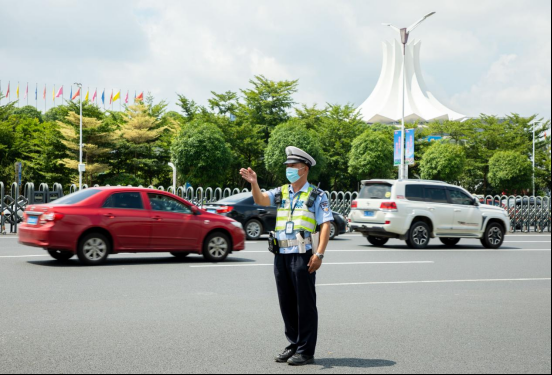 在凤翔路与民族大道辅路交叉口,执勤交警挥舞着手势,头顶烈日,无惧高温“烤”验,只为换来交通的畅通和行人出行的平安,让安全出行更有温度。