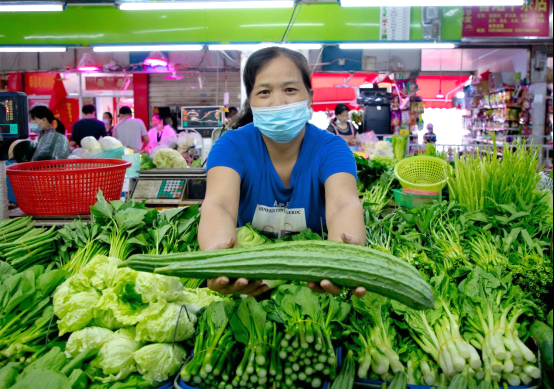 在埌西市场内,商户热情招呼着前来购买蔬菜的顾客。