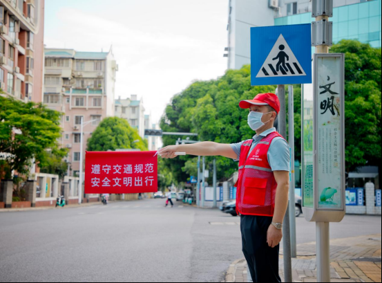 在悦宾路口,志愿者手拿印有“遵守交通规范 安全文明出行”字样的红色旗子,引导车辆、行人安全有序过马路。