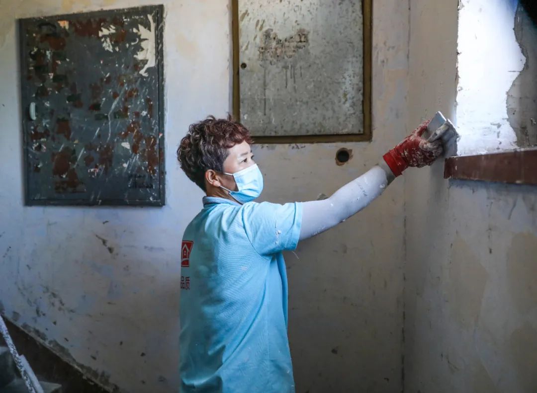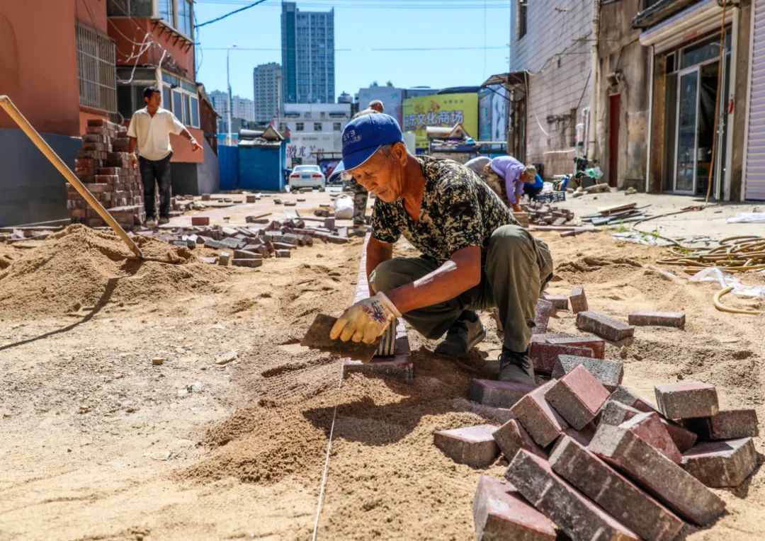 8月31日,在元宝区广济街道县前北小区和宝山大街小区里,老旧小区改造工程正在紧张施工中。在县前北小区,施工人员在对小区地面进行铺设地砖。宝山大街小区里,楼道刮大白、换管道和粉刷外墙体等工作同时进行。