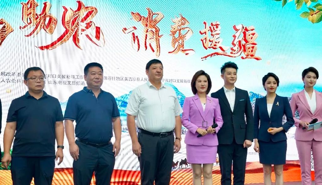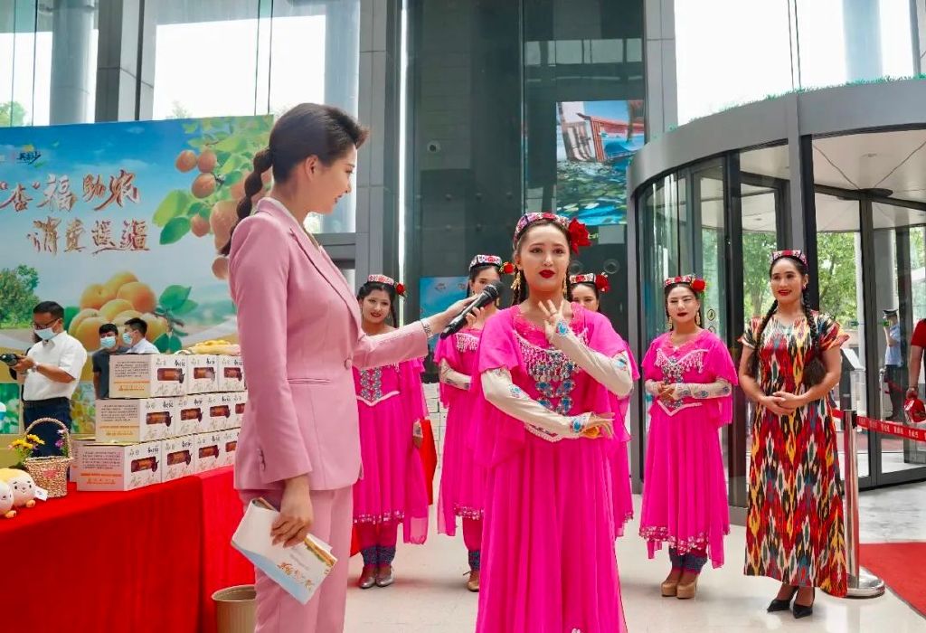 为了宣传、介绍甜美多汁的英吉沙杏,山东广播电视台的主持人们也化身为“夸夸团”成员,现场为英吉沙杏加油助力。