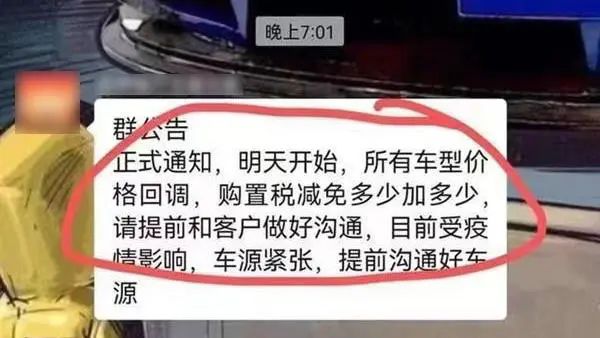 5月31日,财政部、税务总局发布《关于减征部分乘用车车辆购置税的公告》,对购置日期在2022年6月1日至12月31日期间内单车价格(不含增值税)不超过30万元的2.0升及以下排量乘用车,减半征收车辆购置税。该新政之于车企,可谓久旱逢甘霖。当晚,即有部分汽车品牌出台配套促销政策,甚至不乏车企推出“免购置税购车活动”,即在国家补贴50%的基础上,汽车品牌补贴另外50%,消费者相当于“0购置税”买车。新政带来的福利,让不少消费者心生憧憬。 然而,新政实施第一天,却传来让消费者堵心的消息。在市场终端,个别品牌的4S店,玩起了一边减税一边加价销售的戏码。据媒体报道,在某地4S店销售群里,一则群公告显示——正式通知,明天(指6月1日)开始,所有车型价格回调,购置税减免多少加多少,请提前和客户做好沟通,目前受疫情影响,车源紧张,提前沟通好车主。而在某汽车APP平台,也有消费者爆料称打了一圏4S店电话,得到的答复是:购置税减半以后,车价肯定上涨。之前18.6万左右能全款落地的一款车,现在购置税减半以后,需要19万元左右。