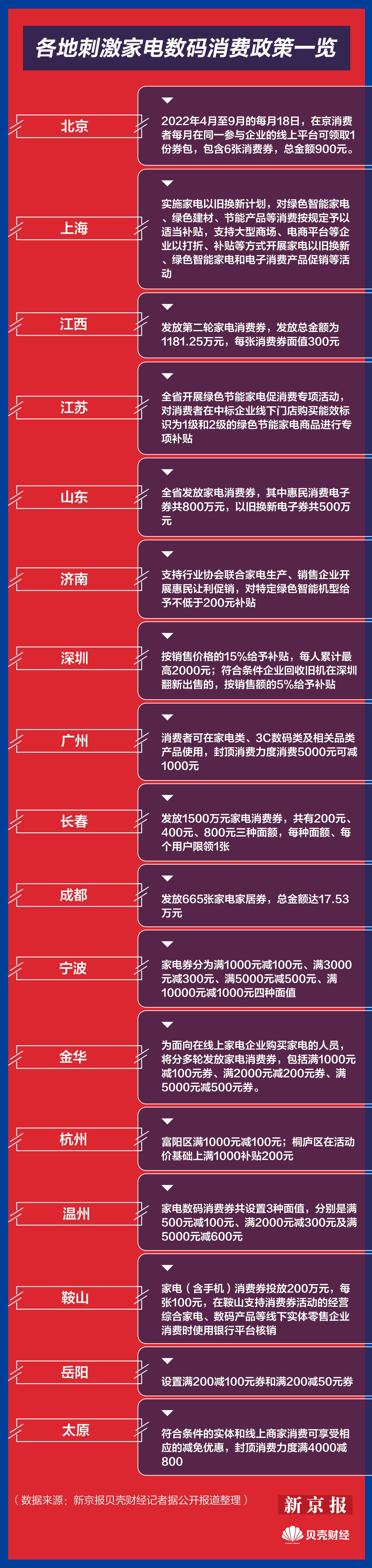 多地政府对家电数码消费者进行补贴。北京、上海、江苏、江西、山东等省份在全域范围内开展家电促销活动。深圳的消费者购买家电数码产品,按照销售价格的15%给予补贴,每人累计最高2000元。 此外,北京、上海、江苏三地在促进家电消费的同时,进一步释放绿色节能消费潜力。 自4月中旬起,北京开始发放绿色节能消费券,针对节能产品进行补贴;江苏开展绿色节能家电促消费专项活动,针对能效标识为1级和2级的绿色节能家电商品进行专项补贴。