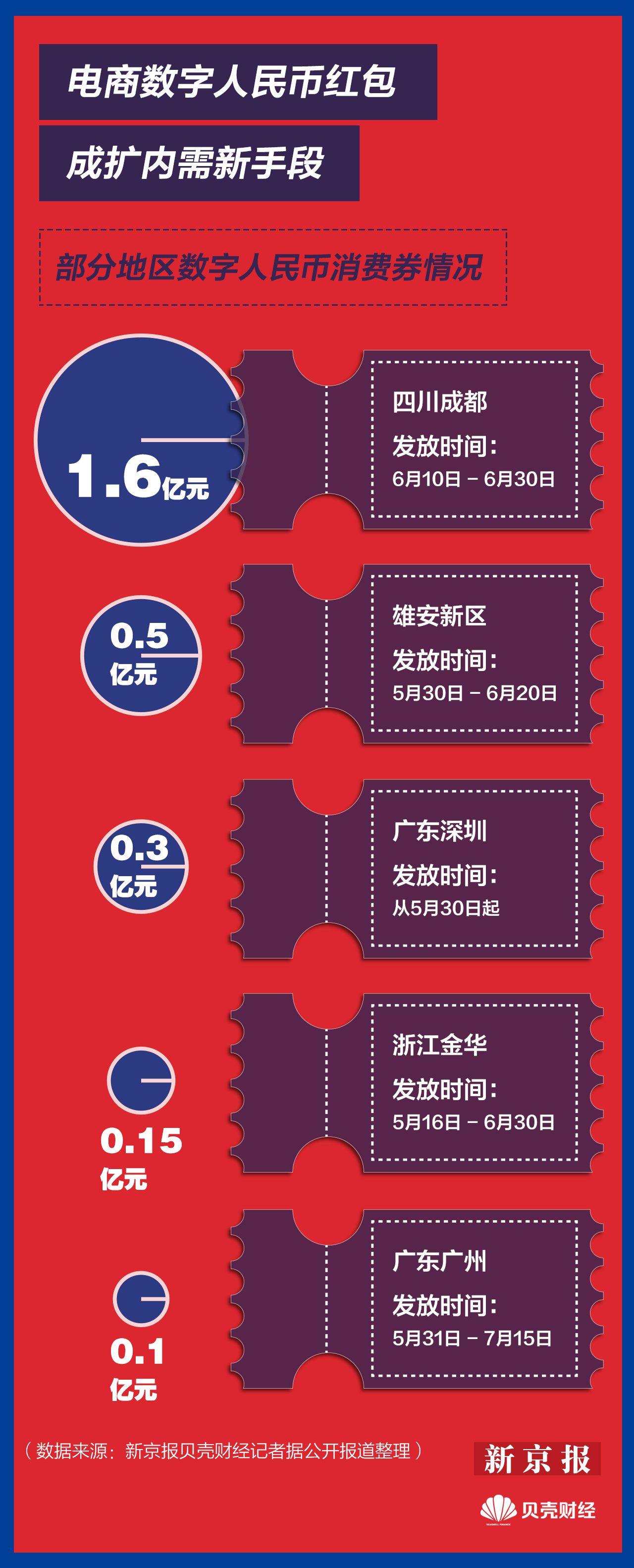 4.除了消费券 电商数字人民币红包成扩内需新手段 消费券热潮持续,多地也推出数字人民币消费券活动。 当前,浙江金华、雄安新区、广东深圳和广州等地发放千万元数字人民币消费券。自6月10日起,成都将通过京东、唯品会、美团三个电商平台分三波次,发放141万份数字人民币红包,总额1.6亿元,涵盖零售、餐饮、文化、旅游等行业。