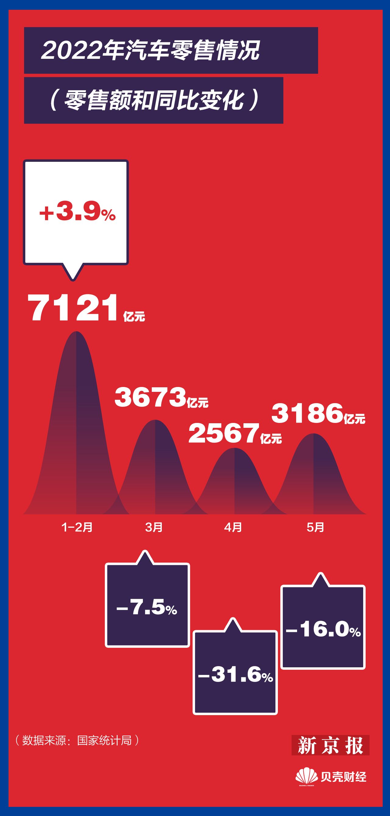 2. 六省份17城施行汽车消费补贴措施 北京减半购置税 最高可获得1万元补贴 受疫情等多重因素影响,2022年,汽车零售额连续3个月降低。5月,我国汽车类社会零售额为3186亿元,同比减少16.0%,前五个月同比减少9.9%。