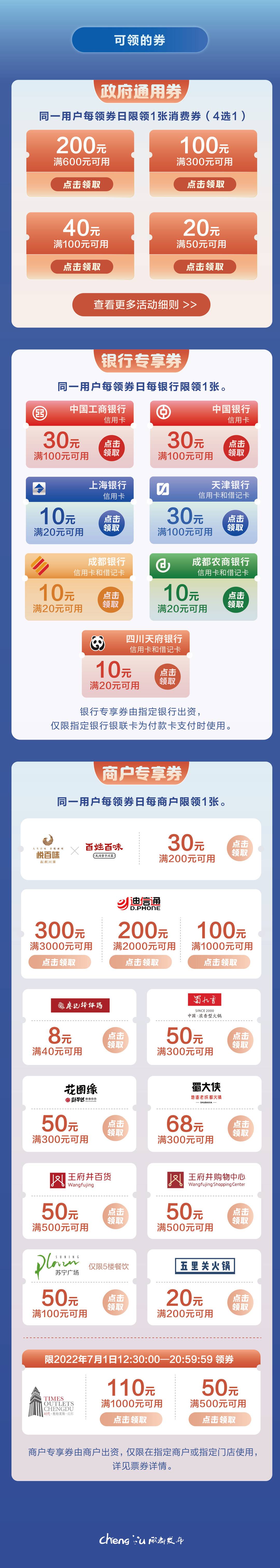 还记得上周五埋的彩蛋吗?兑现来的就是这么快,2022年7月1日起,你们期待已久的成都线下消费券带着更多惊喜返!场!了! 据成都市商务局相关负责人介绍,此次消费券财政资金规模1亿元,发动银行、商户叠加优惠,共计发放2亿元,涵盖零售、餐饮、文旅等行业。 还是原来的领券时间 第一波次:2022年7月1日(周五)12:30 第二波次:2022年7月8日(周五)12:30 第三波次:2022年7月15日(周五)12:30 第四波次:2022年7月22日(周五)12:30 还是原来的领券渠道 打开云闪付APP-首页-成都消费券活动页面领券 一图get领券攻略 不一样的是! 本次福利全面升级 两招带你玩转本期消费券 福利一: 在政府通用券不变的基础上,新增银行和商户专享券,三“券”齐发! 政府通用券“满600元减200元”、“满300元减100元”、“满100元减40元”、“满50元减20元”四种类型市民可按需选择一种领取一张,所有活动商户通用! 银行专享券是银行出资为持卡人提供的专享福利,消费者在每家指定银行都有机会领取1张,领券成功后仅限指定银行银联卡为付款卡支付时使用,在所有活动商户均可使用。 有工商银行、中国银行、上海银行、天津银行、成都银行、成都农商银行、四川天府银行7家银行银联卡的小伙伴们提前在云闪付APP内绑卡哦! 商户专享券是商户出资提供的专享福利,为你的逛吃“买单”,消费者在每家指定商户都有机会领取1张,领券成功后仅限指定商户门店使用。 悦百味•品质川菜×百姓百味•民间拿手川菜、迪信通手机连锁、廖记棒棒鸡、蜀九香火锅、花图缘烤肉、蜀大侠火锅、王府井百货、王府井购物中心、苏宁城市奥特莱斯(限5楼餐饮)、五里关火锅、时代奥特莱斯,等你来打卡! 最重要的是 以上3种券 人人都有机会领取!