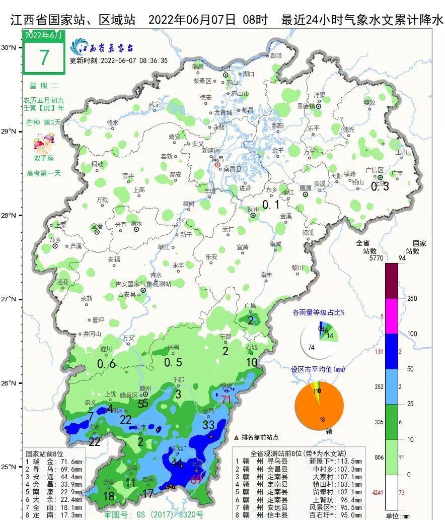 本文转自:江西日报 江西省气象局解除重大气象灾害(暴雨)Ⅲ级应急响应 6月6日8时至7日8时,江西全省共有3县(市、区)的5个测站出现大暴雨,11县(市、区)的131个测站出现暴雨,以赣州寻乌县新屋下114毫米为最大,赣州会昌县中村乡107毫米次之。 预计今天白天到晚上赣州市南部阴天有中雨或雷雨,局部地区有大到暴雨或短时强降水。赣州市北部阴天间多云,部分地区有阵雨或雷阵雨,局部大雨;九江、景德镇两市和宜春、南昌、上饶三市北部多云间晴天,早晨局部地区有雾;全省其他地区多云间阴天,局部有阵雨或雷阵雨。江西全省雷雨来时,局部地区可伴有强雷电、短时强降水、雷暴大风等强对流天气;强降水与前期降水落区重合,地质灾害和中小河流洪水、山洪风险较高,注意加强防范。