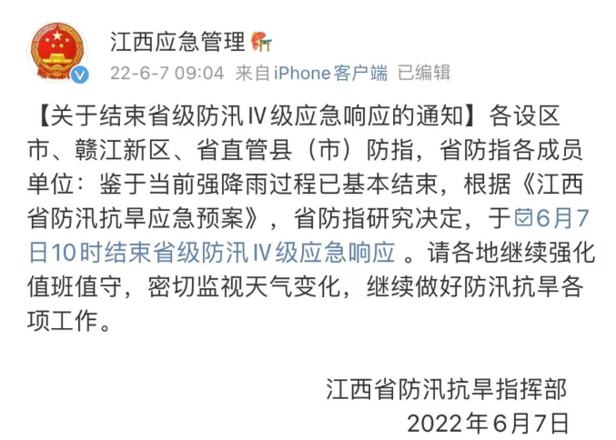 另外,记者从江西省气象局获悉,目前主雨带已南压到华南,江西暴雨天气基本结束。未来赣北、赣中转为多云到晴天天气,赣南仍有雷雨天气、局部有大到暴雨或短时强降水。江西省气象局直属各单位,局应急办、办公室、减灾处、观测处、预报处已解除重大气象灾害(暴雨)Ⅲ级应急响应状态。各设区市气象局可根据实际研判,调整或解除相应级别的应急响应。 江西省级防汛Ⅳ级应急响应结束 鉴于当前强降雨过程已基本结束,根据《江西省防汛抗旱应急预案》,省防指研究决定,于6月7日10时结束省级防汛Ⅳ级应急响应。请各地继续强化值班值守,密切监视天气变化,继续做好防汛抗旱各项工作。