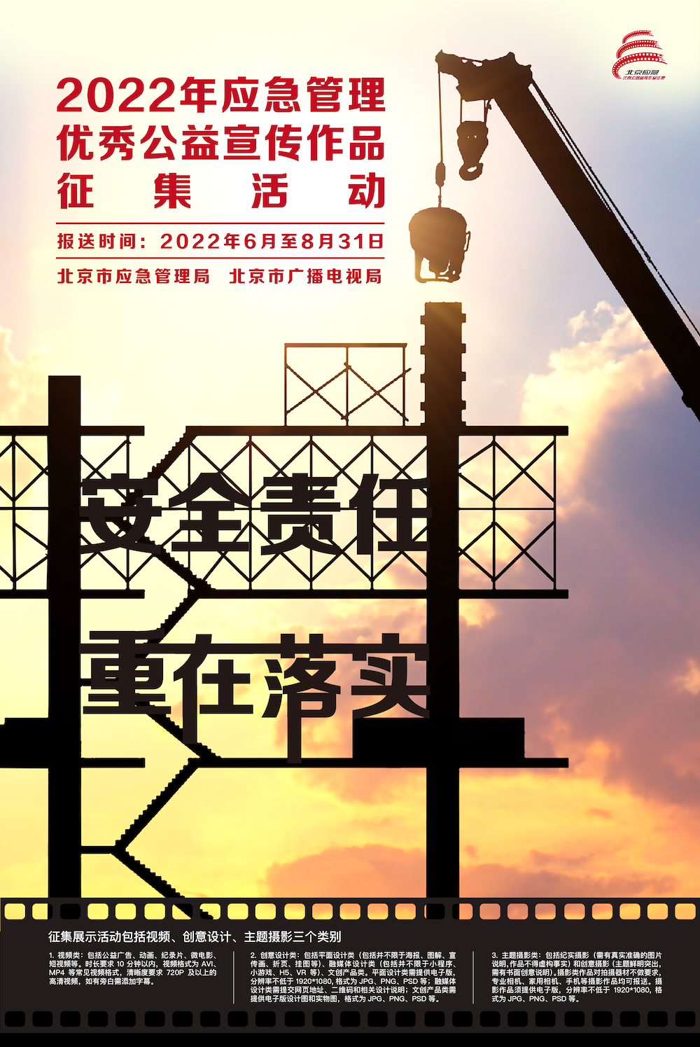 新京报讯 近日,由北京市应急管理局、北京市广播电视局联合开展的,以“安全责任 重在落实”为主题的“2022年应急管理优秀公益宣传作品征集展示活动”正式启动。
