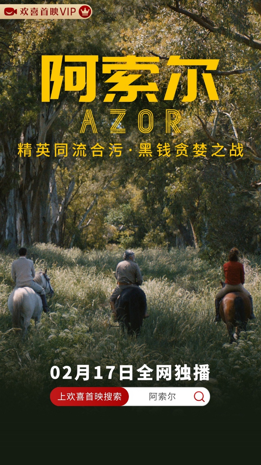 2023年2月17日,入围第71届柏林国际电影节遇见单元的电影《阿索尔》在欢喜传媒旗下的流媒体平台“欢喜首映”独播上线。《阿索尔》通过刻画一位瑞士私人银行家的阿根廷寻金之旅,讲述当巨大财富降临时,上流阶层对良知道德弃如敝履,哪怕手沾鲜血也要攫取金钱的故事。